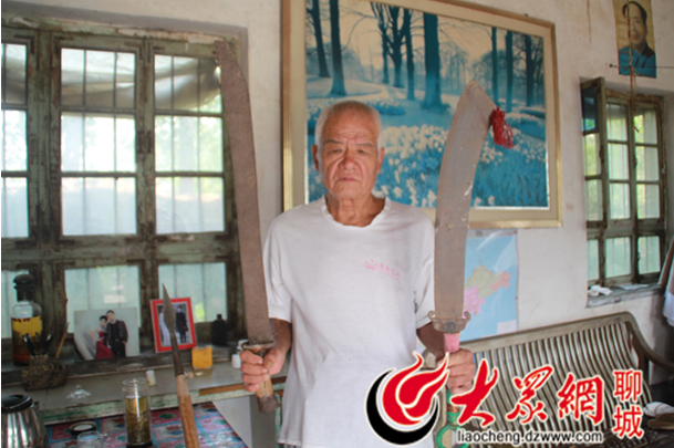 老书记王光木向记者展示父辈留下的当年砍杀侵华日军和日伪军的大刀。大众网见习记者 侯晓 摄