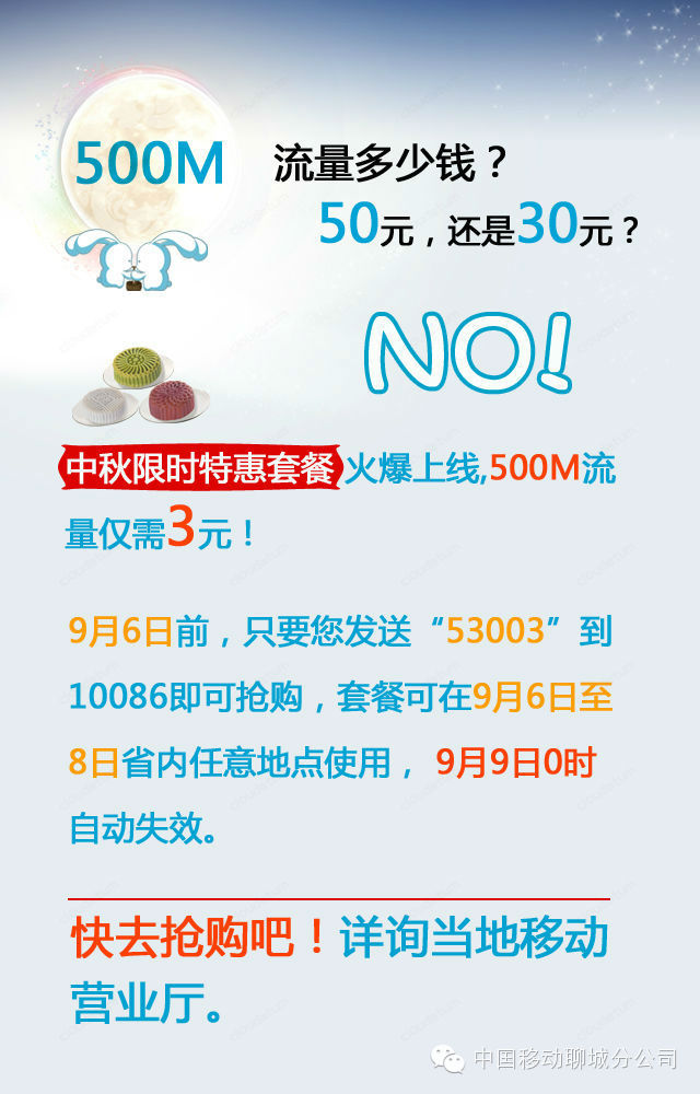 小编告诉你,现在不用愁,聊城移动送大礼——中秋特惠3元包500M!!!