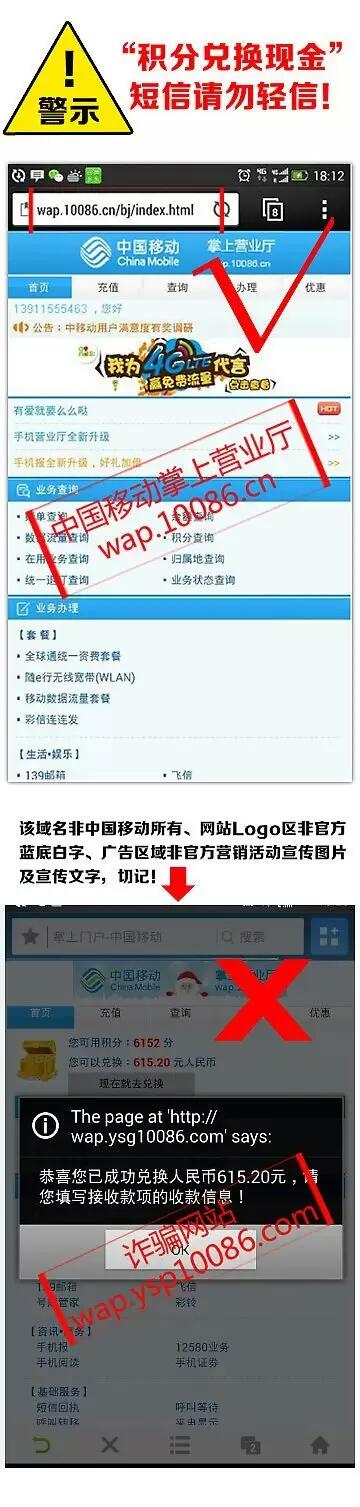 这两天陆续接到客户反映接到“关于积分兑换”的宣传短信,内容大意是“尊敬的用户:您的手机积分已满足兑换XX元的现金礼包,请用手机登陆wap.ysg10086.com(或者 wap.qbzla.com ),根据提示领取!中国移动用户点击进入链接页面后,点击“兑换”按钮,页面会提示输入银行卡账号及密码信息。