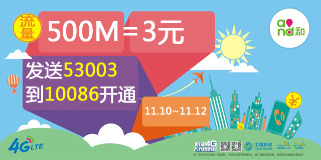 限时特惠套餐:3元包500MB省内2/3/4G流量