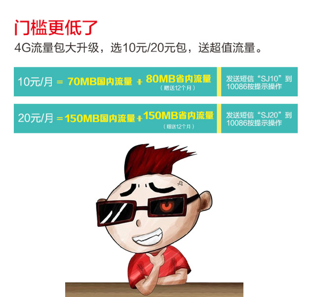 当然我们还有10元包,每月10元,获得70M国内流量+80M省内流量,赠送12个月呢!