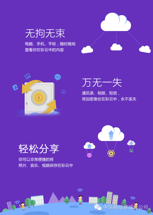 电脑、手机、平板、可以随时随地查看在彩云中的内容。手机里的通讯录、相册、短信,将加密备份在彩云中,永不丢失。非常快捷就能将照片、音乐、视频保存在彩云中,还可以将它们进行分享和传播。