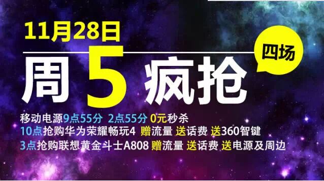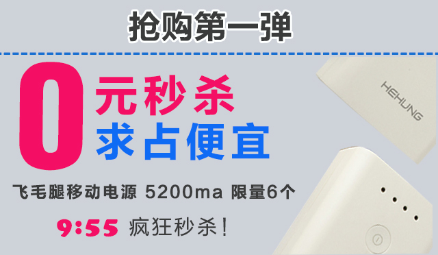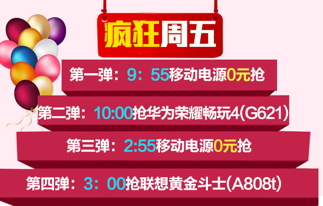 天上掉馅饼,一掉还是四个!喜大普奔啊~ 上午场:9:55 移动电源 0元秒杀 10:00 799元抢购华为荣耀畅玩4(G621)白色 799元=华为荣耀畅玩4手机+150元话费+6G流量+360智键
