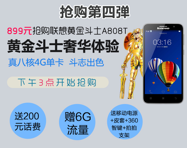 899元=联想黄金斗士A808T手机+200元话费+6G流量+移动电源+360智键+拍拍支架