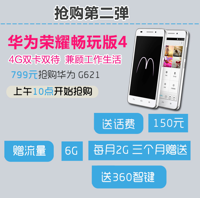 10:00 799元抢购华为荣耀畅玩4(G621)白色
