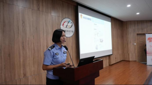 作为本次活动的“重头戏”,来自青岛市公安局崂山分局的刘梅贞警官以“反诈是门必修课筑牢防线守好责”为主题,为青岛科技大学中德学院的师生们带来了一场别开生面的反诈“公开课”。课堂上,刘警官通过实际案例、影视片段,为在场师生详细剖析了当前电信网络诈骗的严峻形势及常见诈骗手段。