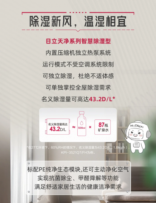 针对不同空间的除湿需求,日立天净系列智慧除湿型提供了更灵活的解决方案。其内置独立压缩机热泵系统,运行完全不受空调系统限制,即使在春秋等无需制冷的潮湿季节,也能单独启动除湿功能,避免传统设备“为除湿被迫开空调”的能源浪费。