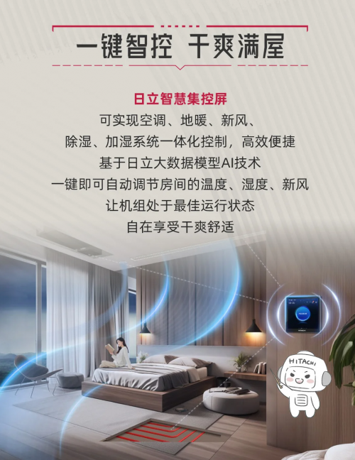 依托日立大数据模型与AI技术,集控屏能根据实时环境参数自动调节运行状态,无论是客厅观影需快速降温除湿,还是卧室休憩需维持恒温恒湿,一键即可激活适配模式。这种“主动服务”式的智能体验,不仅简化了操作流程,更通过精准调控实现节能运行,让用户在闷热天气中无需费心,就能坐享干爽舒适的室内环境。