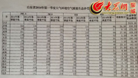 日前,今年一季度山东17市空气质量排名情况出炉。记者了解到,一季度,山东省向17市共发放空气质量生态补偿资金7029万元。其中,聊城市共获得补偿资金950万元,为全省最高。